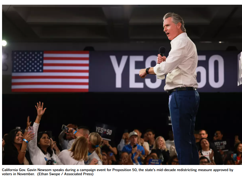 加州州长加文·纽森提议重新划分该州的52个国会选区,以“反击特朗普在德克萨斯州的权力扩张”。他说,如果德州为了保住众议院的控制权而重新划分选区以利于共和党,那么加州也应该这样做以利于民主党。