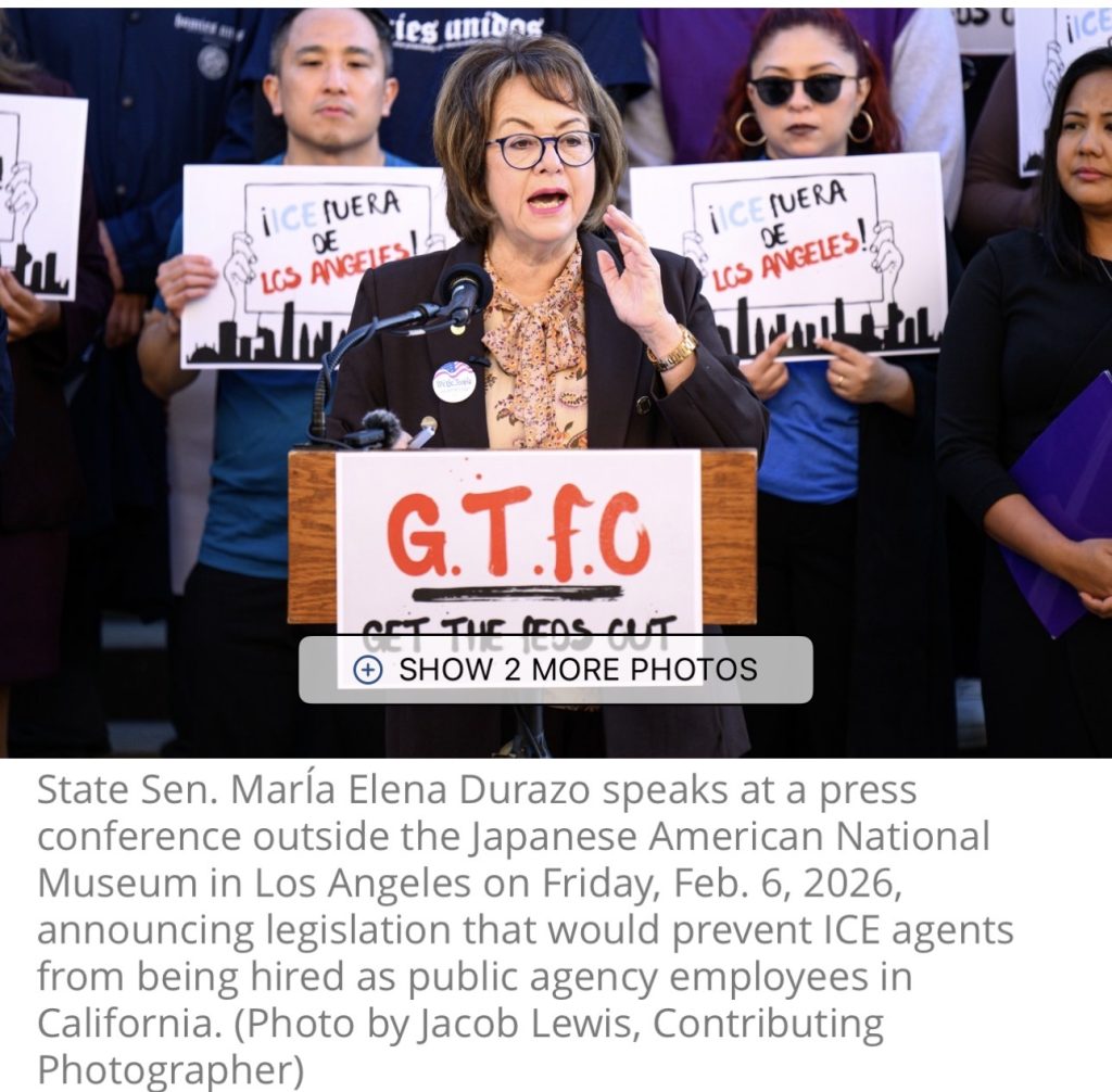 州参议员。 洛杉矶共和党的玛丽亚·埃琳娜·杜拉索(María Elena Durazo)正在考虑签署该拟议立法的共同作者,她说,自特朗普上任以来,“移民执法已经变成了无法辨认的东西——军事化的专制力量,在没有逮捕令、没有问责制、没有任何人性意识的情况下运作。”