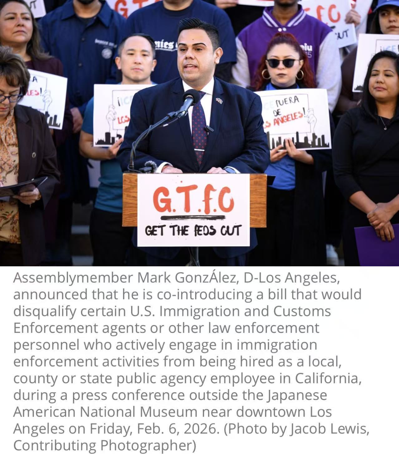 “我今天将提出一项法案,该法案在加州划清了道德界限。 洛杉矶州众议员马克·冈萨雷斯(Mark González)说:“我们称之为我们所看到的,就像我们感受到的那样,尊重地称它为《GTFO ICE法案》——换句话说,让联邦调查局出去。”