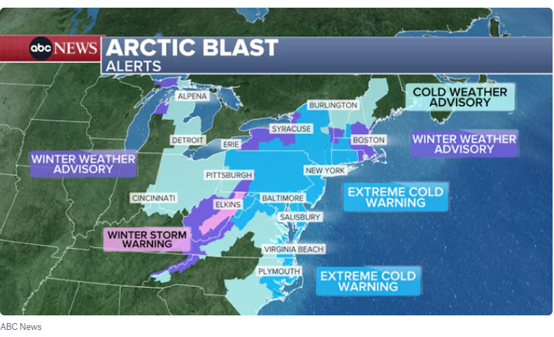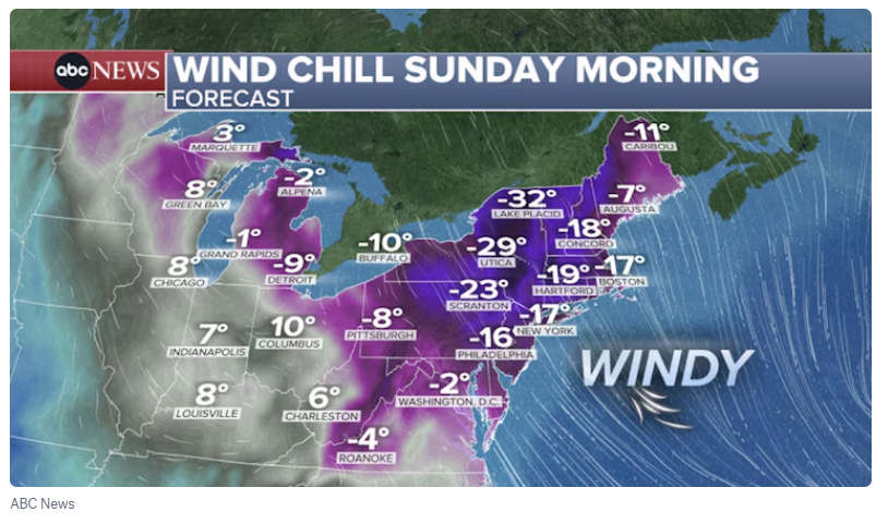 今天早晨,宾夕法尼亚州和纽约州北部地区的体感温度也降至零下10到20多度。东北部大部分地区,包括宾夕法尼亚州、新泽西州、纽约州、康涅狄格州、马萨诸塞州和佛蒙特州,都发布了极寒天气预警。