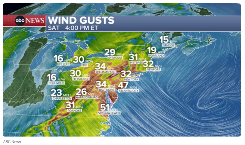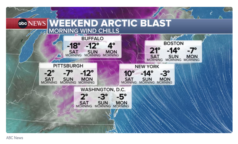 周六,东北部地区将迎来严寒天气,严寒气温和强风将共同作用。周六下午,气温将开始骤降,东北部地区的阵风风速将达到每小时30到50英里以上。这种组合将使东北部大部分地区的体感温度降至个位数,部分地区甚至会降至零度以下。
