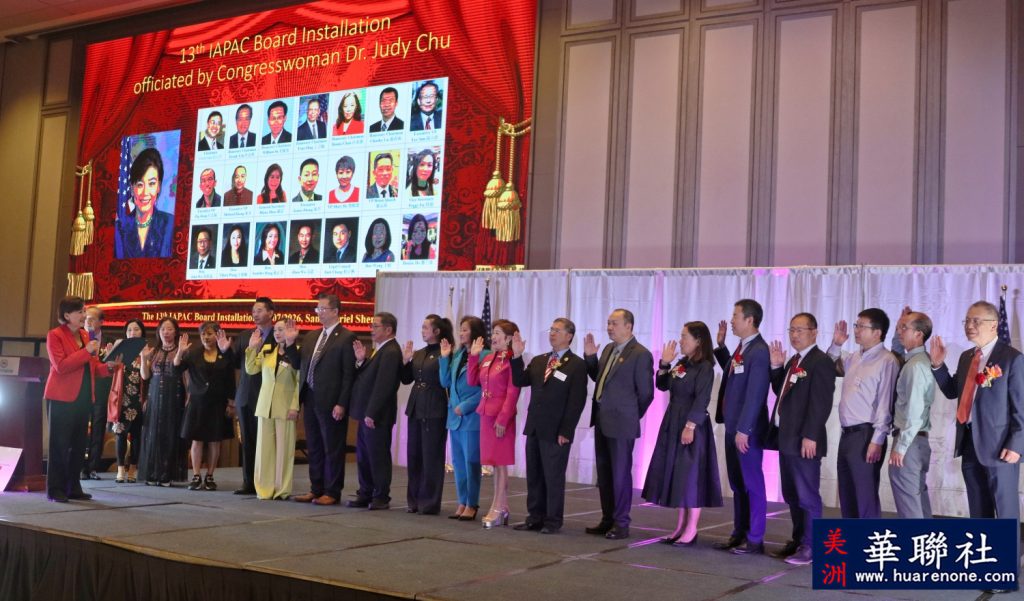 【美洲華聯社2月8日洛杉磯報道】美國華人政治聯盟(IAPAC)第十三屆理事會就職典禮暨慶祝成立26週年紀念晚宴於2月7 日(星期六)在聖蓋博市喜莱登大酒店隆重舉行。卸任主席盧春雨在擔任兩屆主席期滿後功成身退交棒給新任主席高元培,新舊主席移交印信由創會主席蔡松芳主持監交儀式,歷屆主席張作波,葉安利,史振發(共同創辦人),丁言愉,莊春惠一起見證。