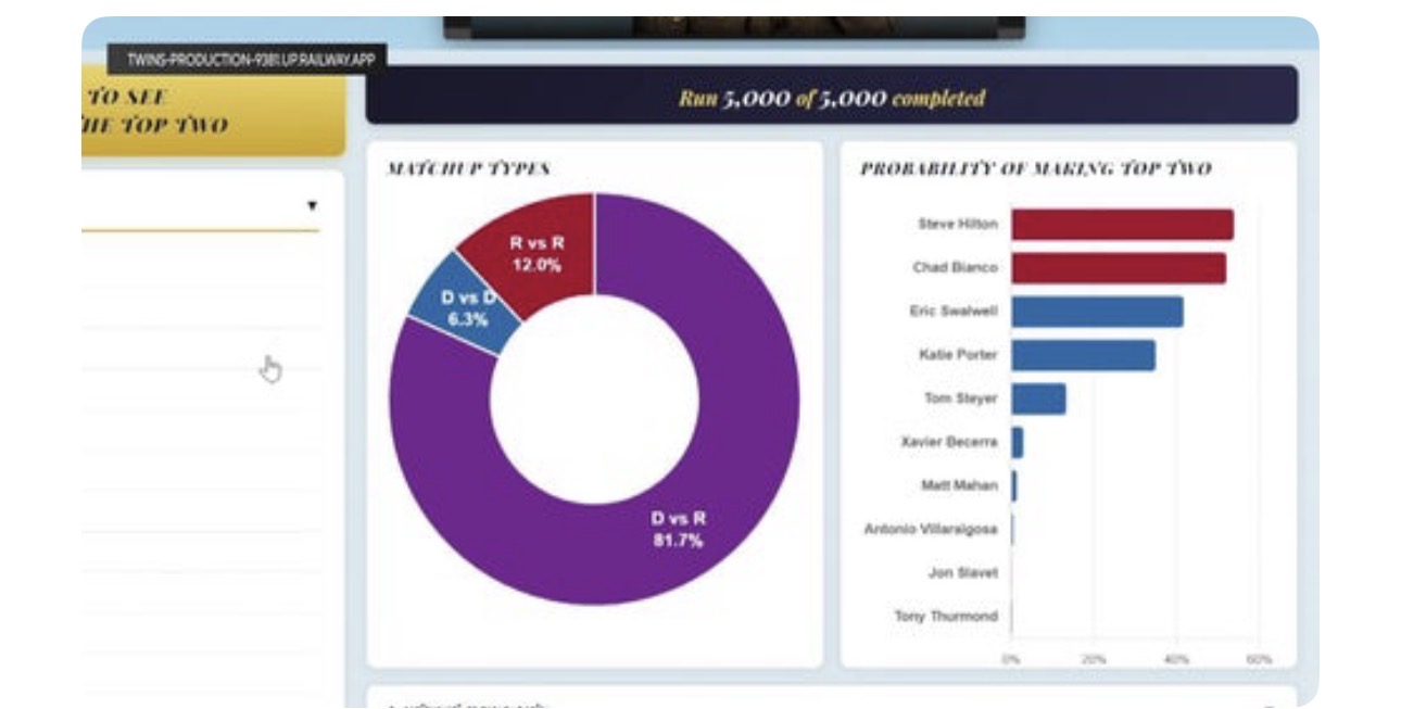 这是保罗·米切尔的政治模拟创作。 这位民主党数据专家还帮助绘制了第50号提案的国会重新划分界限,他推出了TWINS,这是一个前两名初选模拟器,显示了任何候选人组合赢得州长竞选初选的机会。