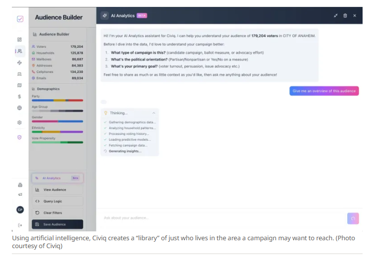 据橙县记事报报道,Civiq由南橙县本地人科尔·帕特森于2月10日推出。该平台利用人工智能技术,将选民登记信息、过往选举结果、竞选资金数额、人口普查详情等数据汇总在一个以颜色编码呈现的平台上,既可以查看全州概览,也可以按选区或城市进行精准筛选。简而言之,该平台创建了一个“数据库”,详细记录了竞选活动目标区域内的选民信息。