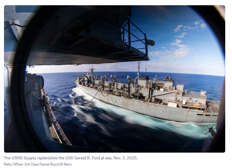 2025年11月3日,补给舰“供应”号在海上为“杰拉尔德·R·福特”号航空母舰进行补给。