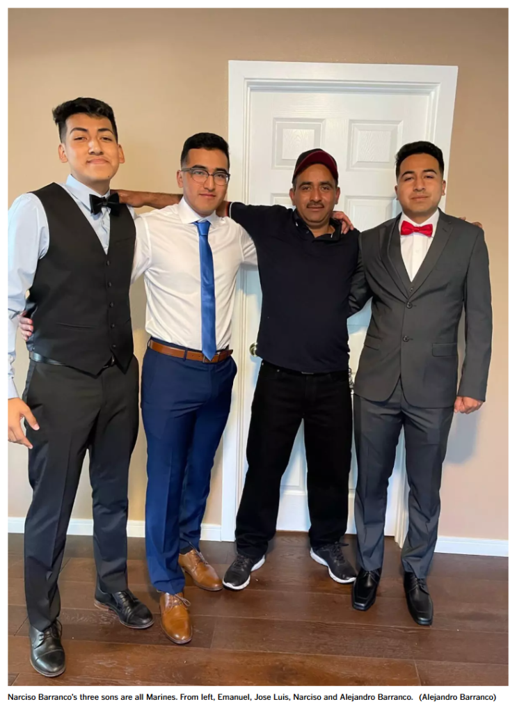 纳西索·巴兰科的3个儿子都是海军陆战队员。从左至右:伊曼纽尔、何塞·路易斯、纳西索和亚历杭德罗·巴兰科。(亚历杭德罗·巴兰科摄)