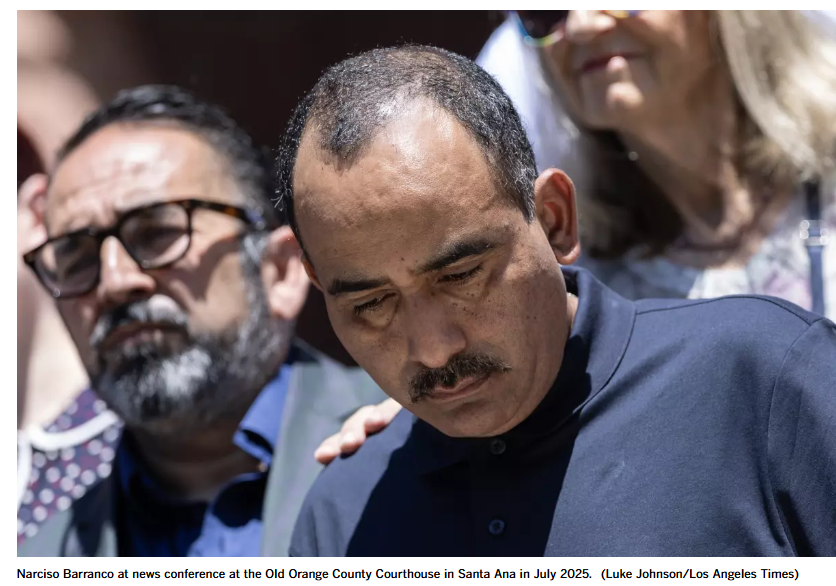 捕过程被视频记录下来并在社交媒体上广泛传播。不久之后,他的长子接受了媒体采访,使他父亲的案件持续受到关注。这位名叫亚历杭德罗·巴兰科的海军陆战队退伍老兵当时告诉洛杉矶,他的父亲被喷了辣椒水,肩膀脱臼。