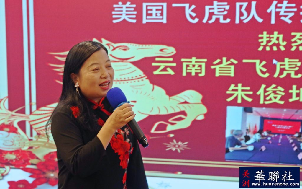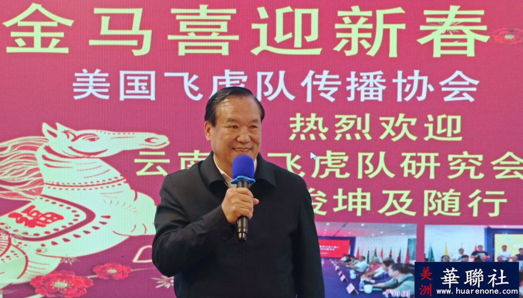 鹿强、苏王秀兰、许成武、申春平等也先后致辞。鹿强表示,美中和平友好促进会的宗旨就是推动美中友好、促进世界和平。弘扬和传播飞虎精神,是推动美中民间友好重要内容,还有很多事情要做。他乐见美中两个飞虎队研究组织密切合作,让更多的年青一代了解飞虎队的历史、记住飞虎队的历史。苏王秀兰表示,她去过云南,感受到了云南山水的美丽和人民的善良、淳朴,下次再去云南,一定要拜访云南飞虎队博物馆。许承武表示,美国飞虎队传播协会是美国华人社团联合会的重要社团之一,多年来为弘扬飞虎精神做了大量工作,受到社区的肯定,我们要继续支持。申春平表示,他曾带美国知名演员去云南拍过电影,云南给他留下深刻印象。在他的法律实践中,发现美国政府对在海外的美国人的遗骸回归,非常重视,在这些方面应该有很多工作要做。