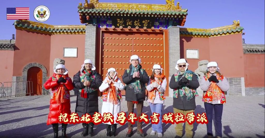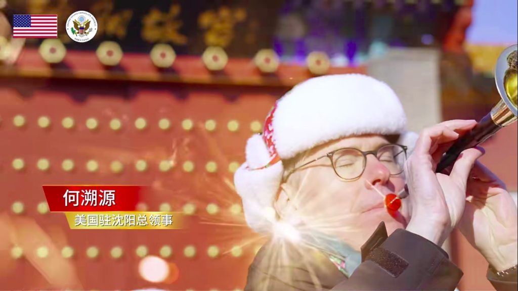 近日,美国驻华大使馆发布外交官演唱中国网络神曲《大东北我的家乡》的拜年影片在网上疯传。影片中,驻沈阳总领事何溯源(William M. Coleman)和多位外交官一起穿上东北大花棉袄,吹唢呐、扭秧歌,齐唱“贼拉拉的爱你呀我的家乡”等歌词。被网民称为最“接地气”拜年。