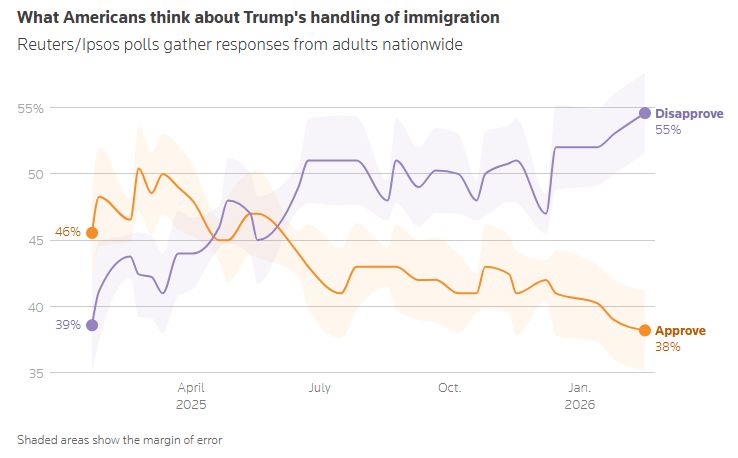 男性选民在特朗普2024年大选中发挥了举足轻重的作用,2025年全年,他在男性选民中的移民支持率都接近50%。但路透社/益普索最新的民调显示,只有41%的男性选民对他的移民政策表示支持。在女性选民中,特朗普在移民问题上的支持率从2025年大部分时间的40%左右下降到最新民调的35%。