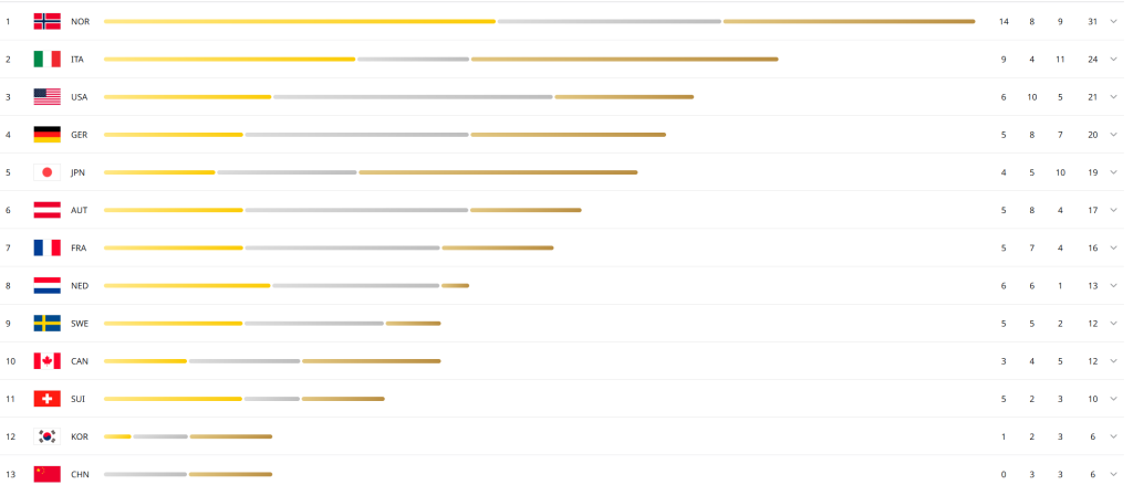 挪威队以14金、8银、9铜的31枚奖牌居于绝对领先地位。美国队以1枚奖牌之差让排在意大利队之后,德国队当天表现出色,奖牌总数达到19枚直追美国。中国队终于结束多日的奖牌荒,赢得1枚铜牌,目前排名第13.