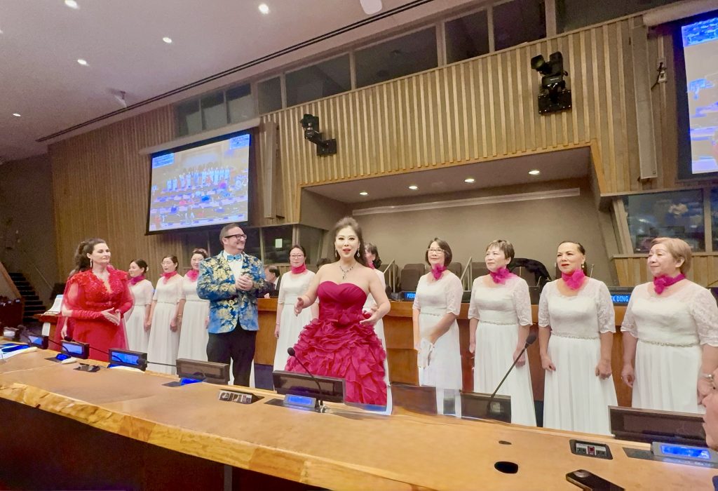 王蓓蓓是旅英歌剧女高音歌唱家、英中演艺协会会长、英国皇家音乐家协会大师成员。专程前来美国参加在纽约联合国总部演出的她表示,这次非常荣幸来到美国,首先参加了在联合国总部大厦举办的“老家在中国”第十届世界华人春晚,这是非常非同寻常的一个机会,让我们的华人走进联合国,这是陈和霞老师多年辛勤耕耘的结果。而后我们在拉斯维加斯举办了2场慈善音乐会,当地观众的反响非常非常热烈。我们把中华文化在海外、联合国这么重要的地方传播,能够让更多人感受到中华文化的博大精深。此行演出让她非常非常的感恩,能够与来自英国的华人华侨合唱团参与整个过程感,她感谢陈和霞老师搭建的这个非同寻常的平台。