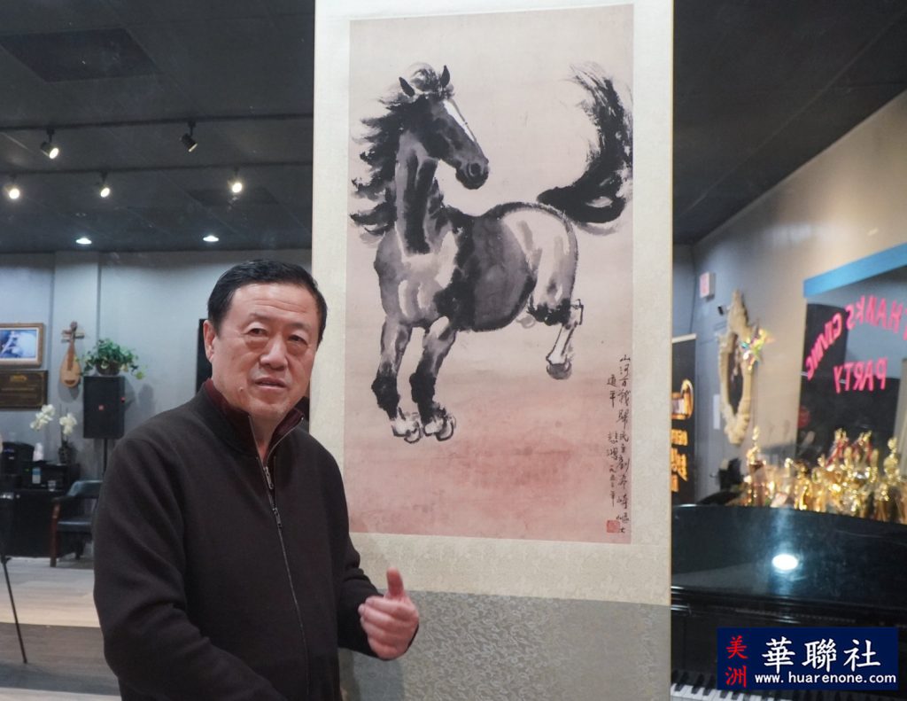 徐小阳在接受采访时表示,这次去纽约参加“老家在中国”的春晚,带去了祖父徐悲鸿先20幅作品,捐赠给关注自闭症儿童的爱心基金会。大家都知道我的祖父以画华马闻名,为什么要画马?因为他爱马一生,他也把马比喻人,说马是人类最好的朋, 所以他有时通过画马来来倾诉。在抗战的时候, 他画的一些作品就以马来代表于我们民族的精神。 比如说画一个回头的马, 他提了字叫“哀鸣嘶战斗、久立向”沧桑。 意思是我要上战场了,回头看一下乡村父老, 我可能一去不复返。他就用这种画法来表现他的一种心情、一种状态。在马年到来之际,他祝洛杉矶的华人朋友马到成功、马年大吉。