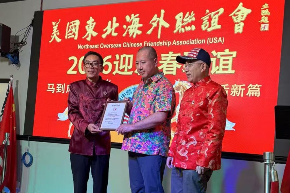 【美洲华联社罗兰岗报道】岁序更新,华章再启。在这个金蛇辞旧、骏马奔腾的岁末年初,2月15日晚,罗兰岗的“老东北大饭店”张灯结彩,暖意融融。来自各行各业的上百位东北同乡欢聚一堂,共同举办了以“马到成功,共话新篇”为主题的马年春节联欢晚会,现场洋溢着浓浓乡情与节日喜悦。森林湖市市议员于淼(Benjamin Yu)出席活动并颁发贺状。