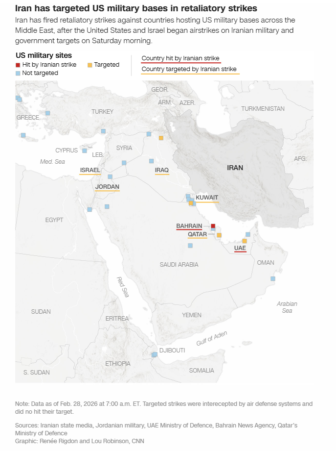 美国和以色列上次对伊朗发动袭击是在去年6月,当时的目标是伊朗的弹道导弹库,削弱了其反击能力。伊朗可能正试图在导弹库尚存时将其用于反击。据报道,阿联酋、卡塔尔、巴林以及伊朗的主要地区竞争对手沙特阿拉伯均发生爆炸。沙特阿拉伯誓言将采取“一切必要措施”自卫。
