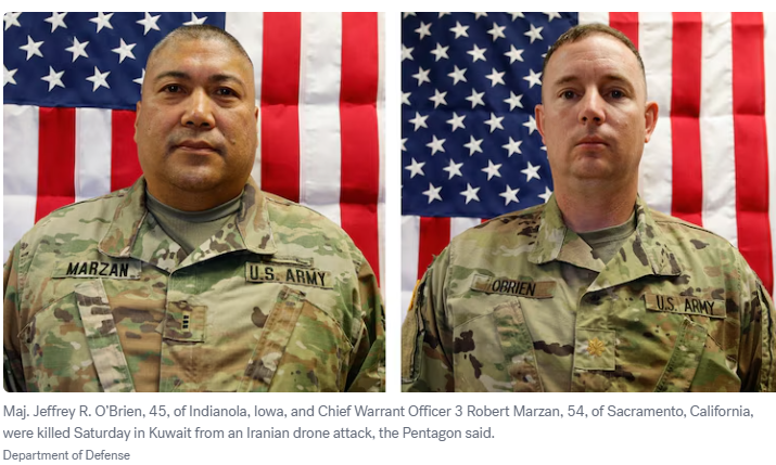 据ABC新闻报道,来自爱荷华州印第安纳波利斯的45岁少校杰弗里·R·奥布莱恩(Jeffrey R. O’Brien)和来自加州沙加缅度的54岁三级准尉罗伯特·马赞(Robert Marzan)于周六在科威特死于伊朗无人机袭击。