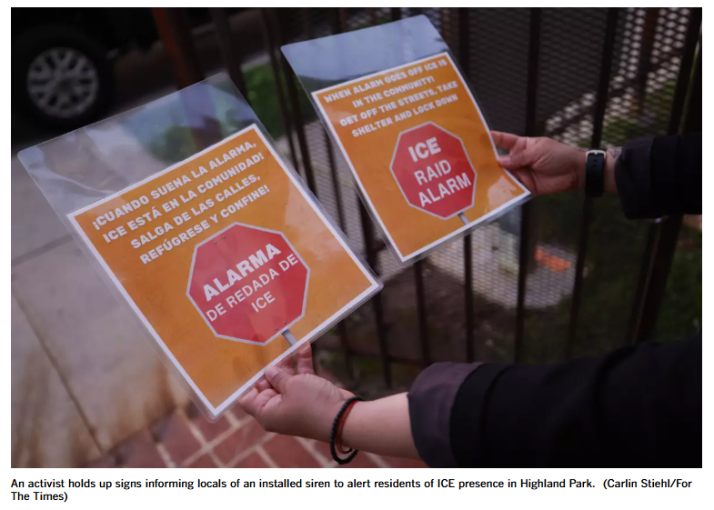 据洛杉矶时报报道,数周以来,活动人士一直在高地公园(Highland Park)各处安装小型但响亮的警报器。其目的是:让人们离开街道,躲进室内以确保安全,避免被拘留。一位当地活动人士说,“至少我们可以提醒社区居民。”