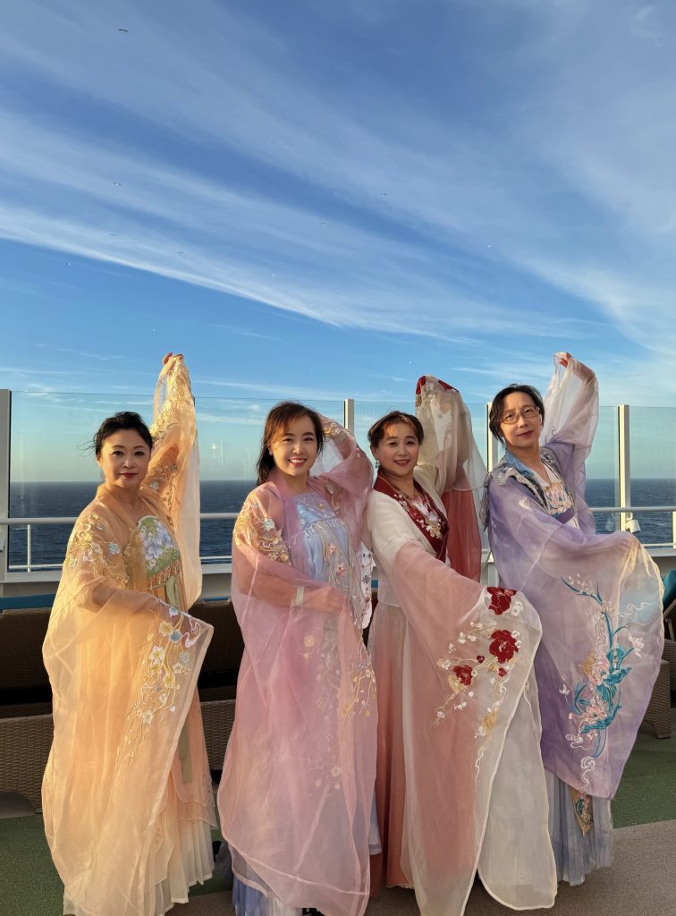 当她们一行出现在邮轮中庭的旋梯上时,更是引起了全场的轰动。事实上从她们换上汉服走出房间开始,不论在走廊还是电梯间,所遇到的人无不表情惊艳并发出赞叹,人们都为汉服明亮的色彩、飘逸的造型、精巧的设计和精美的刺绣所折服。