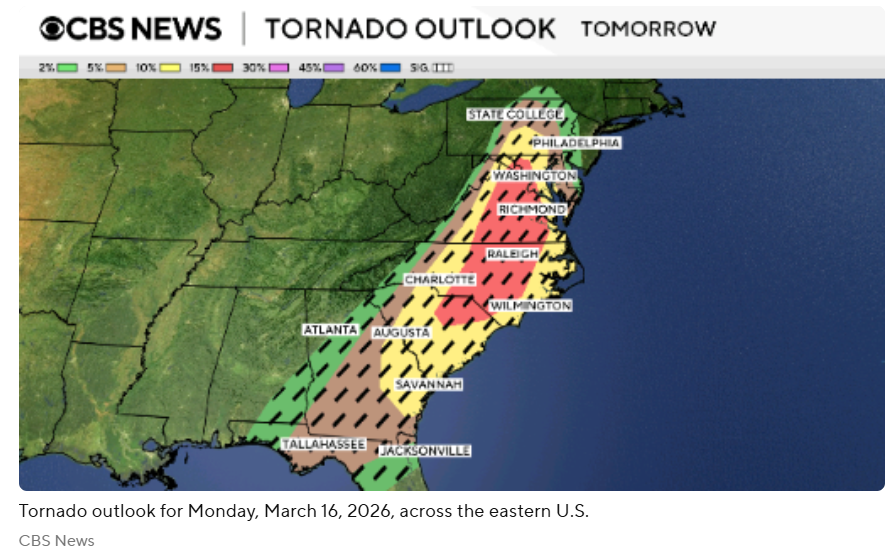 预计周一龙卷风威胁将加剧,中大西洋部分地区将面临中等程度的强对流天气风险。据预报员称,风暴在向东海岸推进的过程中,可能带来龙卷风、破坏性阵风、冰雹和突发性洪水。