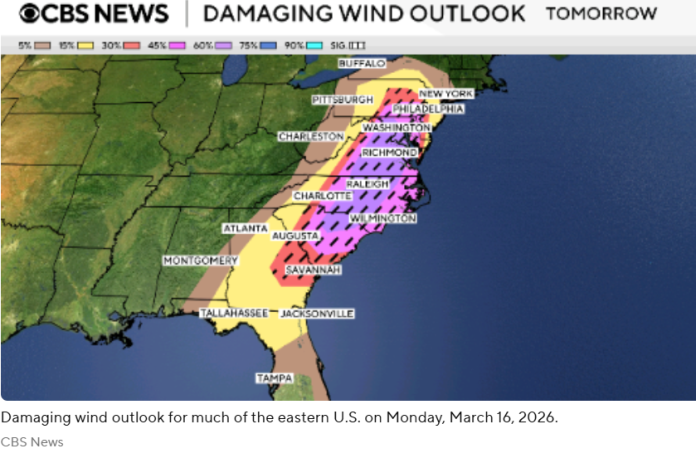 气象部门表示,从南卡罗来纳州部分地区到马里兰州的广大区域最有可能在周一下午遭遇特别严重的强风。这其中可能包括北卡罗来纳州的罗利、弗吉尼亚州的里士满以及美国首都华盛顿特区。气象部门还表示,虽然风险较低,但向北延伸至纽约州部分地区,向南延伸至佛罗里达州北部,也存在风险增加的情况。