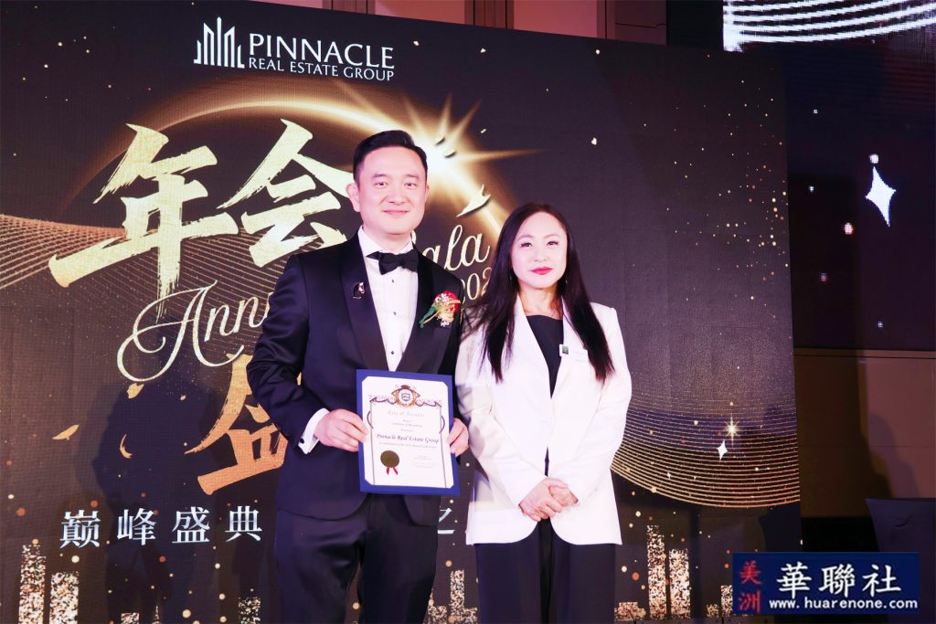王爱琳市长颁发贺状,表彰龚朋良总裁和Pinnacle领先地产集团为社区和经纪人做出的贡献。