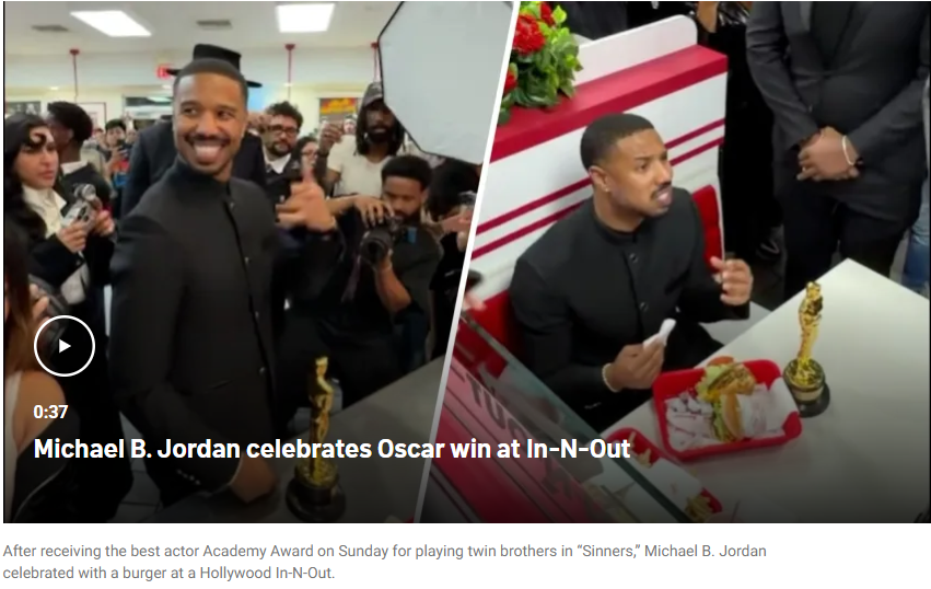 手捧奥斯卡小金人的乔丹在奥斯卡颁奖典礼上荣获最佳男主角后,光顾了距离杜比剧院仅几步之遥的一家餐厅。这是乔丹凭借《罪人》中的出色表演赢得的首个奥斯卡奖。