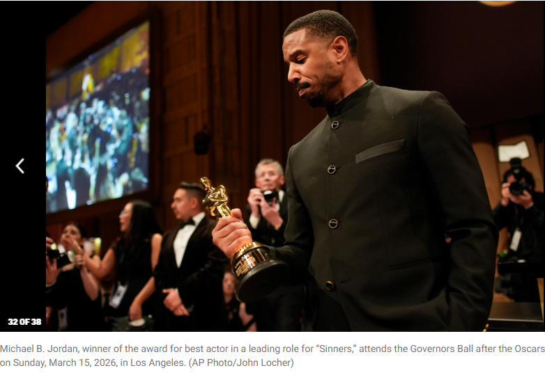 手捧奥斯卡小金人的乔丹在奥斯卡颁奖典礼上荣获最佳男主角后,光顾了距离杜比剧院仅几步之遥的一家餐厅。这是乔丹凭借《罪人》中的出色表演赢得的首个奥斯卡奖。
