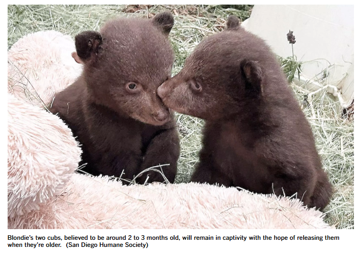 Blondie的2只雄性幼崽目前生活在圣地亚哥人道协会的拉莫纳野生动物中心,该中心表示,它们将在那里接受抚养,目标是“尽可能地让它们有机会重返野外”。