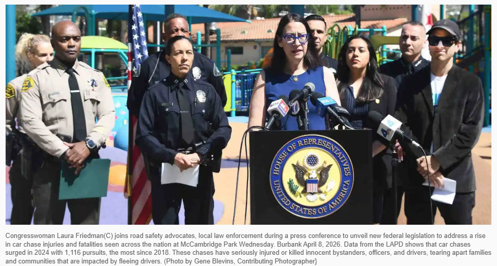 【美洲华联社4月8日洛杉矶讯】由来自伯班克的民主党国会众议员劳拉·弗里德曼(Laura Friedman)提出的《下一代道路安全法案》修订了公共安全法,允许以新的方式使用社区警务服务拨款。弗里德曼在4月8日于伯班克宣布该法案时表示,执法机构将能够利用现有的联邦资金购买新的设备和技术,以安全地结束追逐。