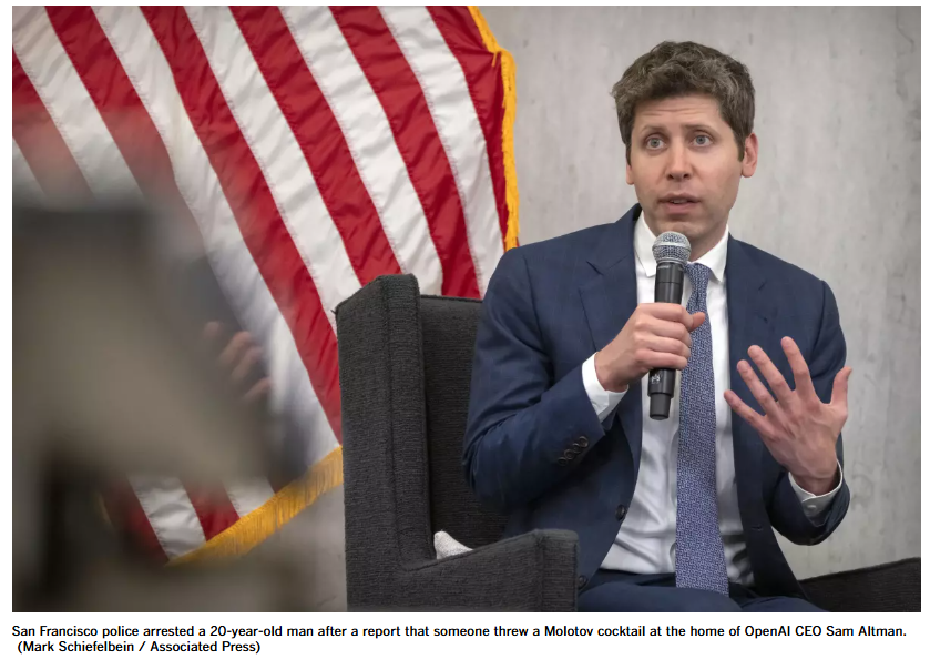 【美洲华联社4月10日旧金山讯】警方称,一名20岁男子因向OpenAI首席执行官 Sam Altman 位于旧金山的住所投掷燃烧弹而被捕。该公司发言人也在一份声明中证实了此次袭击,并表示有人“在我们的旧金山总部发出了威胁”。