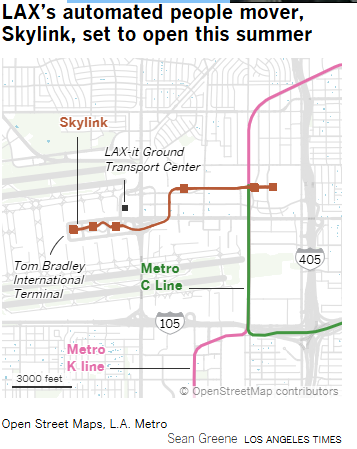 自动旅客捷运系统(Automated People Mover)迟迟未能开放的部分原因是洛杉矶世界机场(LAWA,负责管理LAX的市政府机构)与负责建设该捷运系统的承包商LAX Integrated Express Solutions(简称LINXS)之间持续不断的纠纷。截至9月,LINXS与LAWA之间的纠纷已造成数亿美元的赔偿损失。