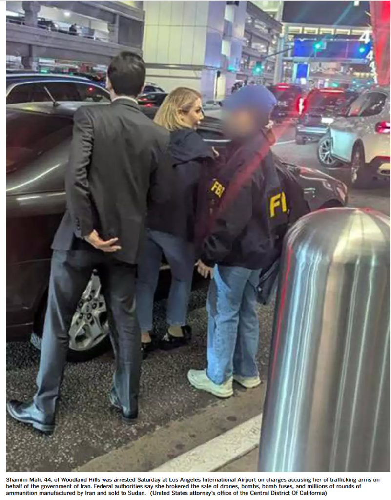 据洛杉矶时报报道,44岁的沙米姆·马菲(Shamim Mafi)在被捕前几小时,于洛杉矶联邦法院被提起刑事诉讼,指控她促成伊朗与苏丹武装部队之间“无人机、炸弹、炸弹引信和数百万发子弹”的买卖。当时她正准备在机场登机前往土耳其。