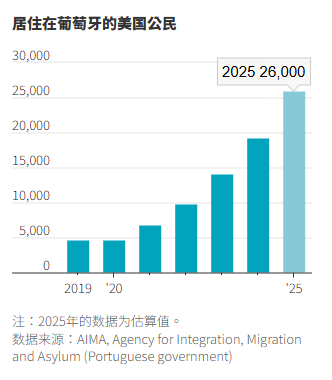 在欧盟27个成员国的几乎所有国家,前来生活和工作的美国人数量都创下纪录并持续上升。葡萄牙官方数据显示,自新冠疫情以来,居住在葡萄牙的美国人总数猛增了500%以上,仅2024年就增长了36%。过去10年里,居住在西班牙和荷兰境内的美国人数量几乎增长了一倍,捷克共和国境内的美国人数量则增长了一倍以上。