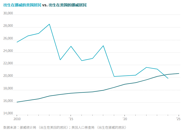 特朗普曾多次在他的集会上遐想吸引挪威移民。但在过去10年里,居住在美国的挪威人数量有所下降,并在2024年跨过一个具有象征意义的里程碑:如今居住在挪威的美国本土出生者人数已经超过居住在美国的挪威出生者。