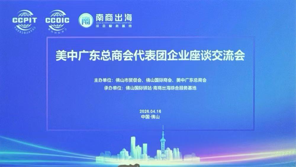 2026年4月16日,美中广东总商会(美国粤商会)会长张铁流率代表团一行12人赴佛山开展经贸对接交流活动。我会组织代表团实地走访佛山国际驿站·南商出海综合服务基地,并与佛山14家商协会和企业开展座谈交流,共探跨境电商、国际物流、品牌拓展等合作新机遇,助力佛山优品拓展海外市场。