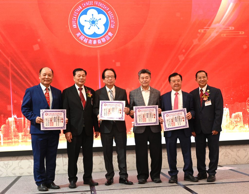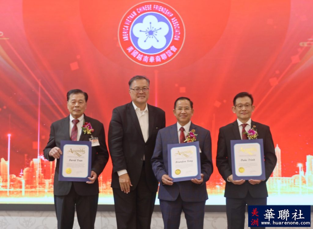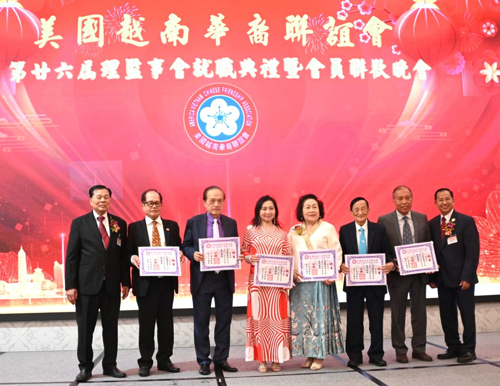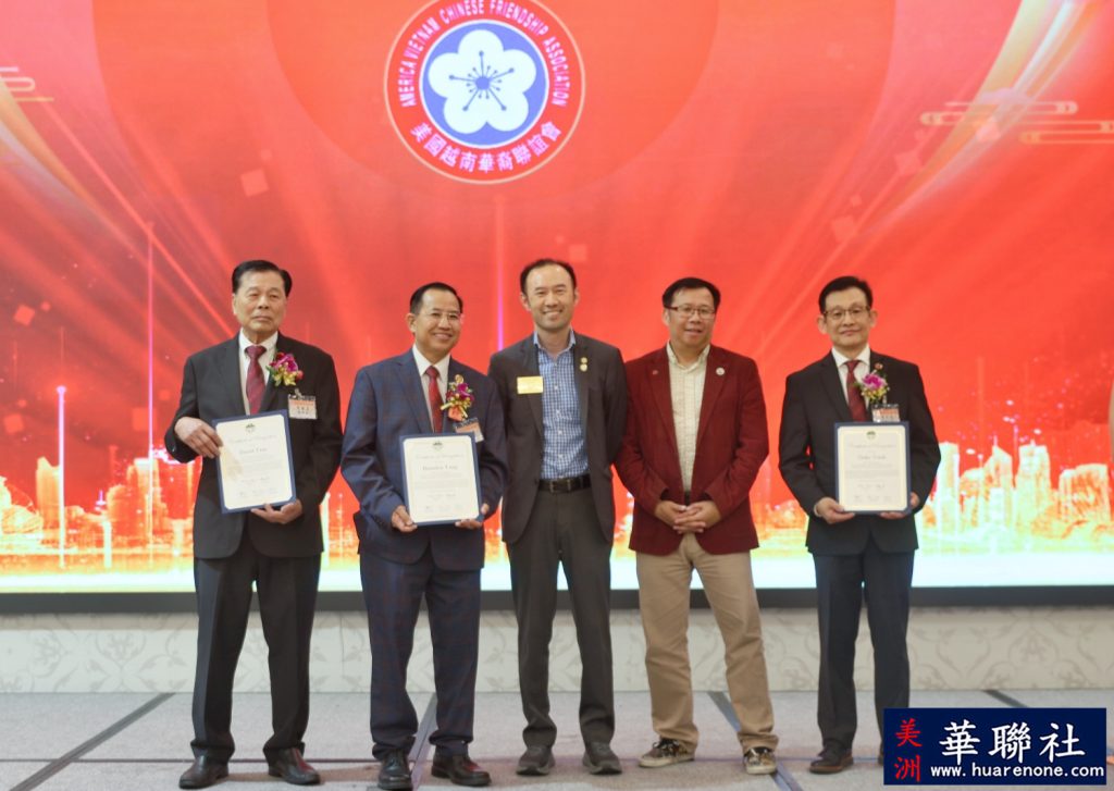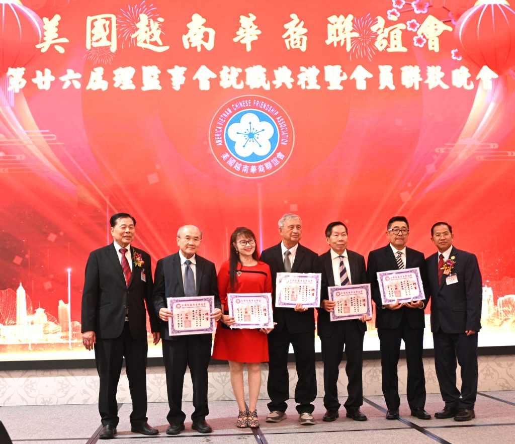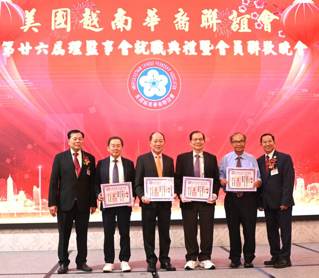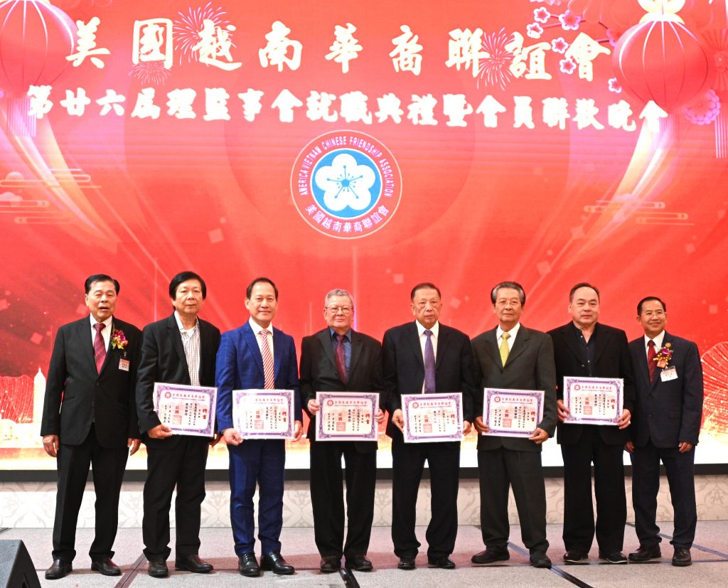 【美洲華聯社4月20日洛杉磯報道】美國越南華裔聯誼會(越華會)於4月18日晚在聖蓋博市半島酒家隆重舉辦第二十六屆理監事就職典禮暨會員聯歡晚會,唐國強接棒鄭偉德擔任新一屆主席,陳銘正為新一屆監事長。