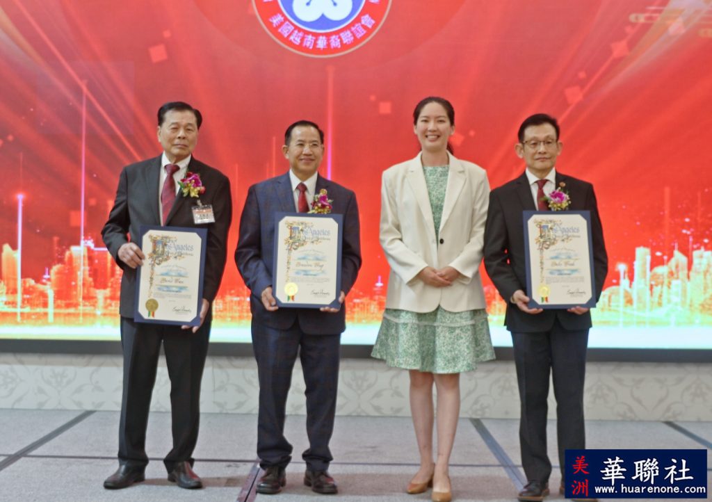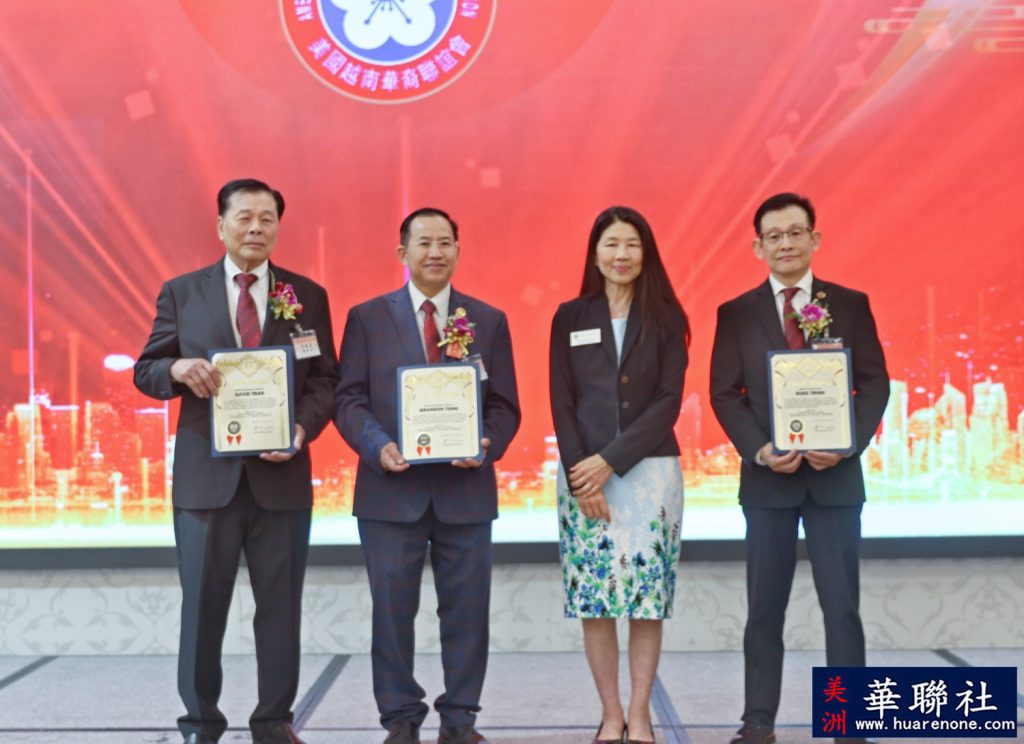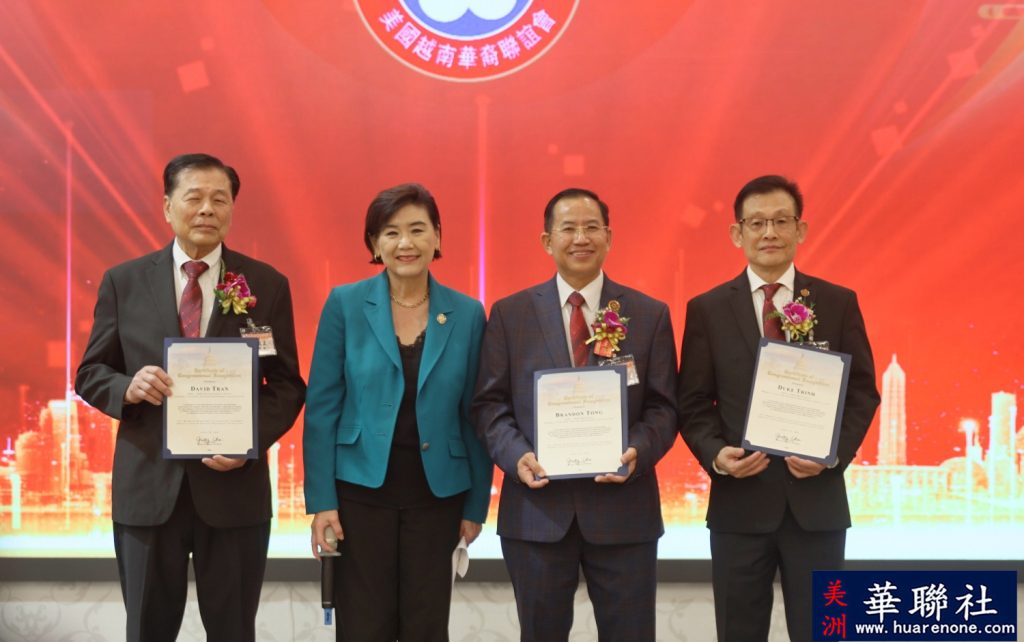 世界越柬寮華人團體聯合會永遠榮譽主席余建強和世界越柬寮華人團體聯合會主席周志松在致辭中,對唐國強、陳銘正當選為美國越南華裔聯誼會主席和監事長表示熱烈祝賀。他們表示,越華會新一屆理監事年輕,充滿活力。相信他們在越華會元老、前會長及全體同仁支持下,同心同德,同心協力,不斷創新,一定會把會務做好,更上一層樓,開創新篇章。