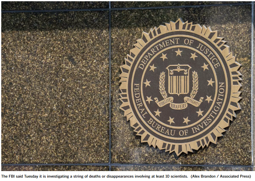 【美洲华联社4月21日华府讯】鉴于国家安全日益受到威胁,FBI周二表示,已对至少10名与高度敏感研究相关的科学家和工作人员的死亡或失踪展开广泛调查,其中包括4名来自洛杉矶地区的科学家和工作人员。