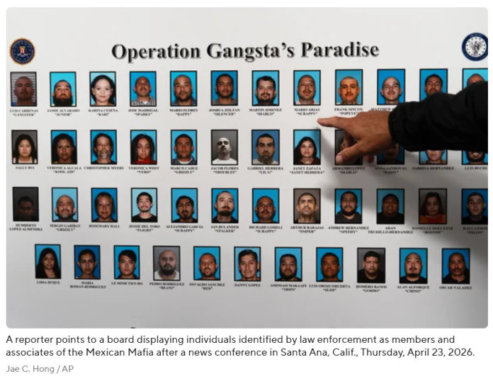 【美洲华联社4月23日洛杉矶报道】在周四清晨联邦调查局(FBI)的一次行动中,数十名涉嫌墨西哥黑手党成员及其同伙在南加州多地被捕。