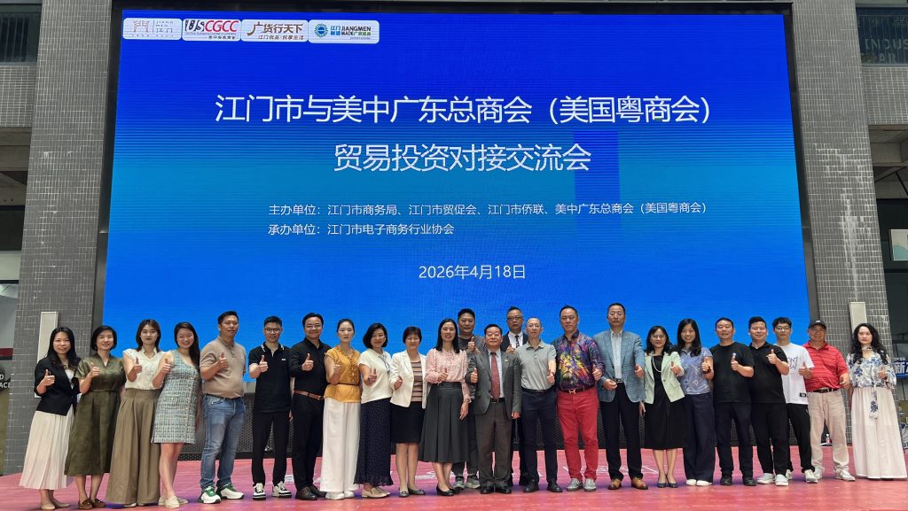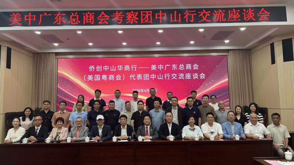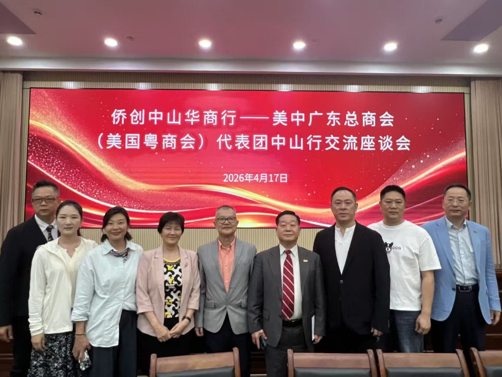 【美洲华联社中国广东省中山市—江门市讯】2026年4月17-18日,中山市侨联联动市商务局、市投促局、黄圃镇镇政府等组织“侨创中山华商行.美中广东总商会(美国粤商会)代表团中山行” 活动,先后走进“以侨助贸”重点联动镇黄圃镇、南粤侨创基地,举办侨助出海专场对接会,美国粤商会、美中物流总商会的侨商侨领与来自中山各行业协会的近40家企业代表,共话合作、共谋商机、共促发展。