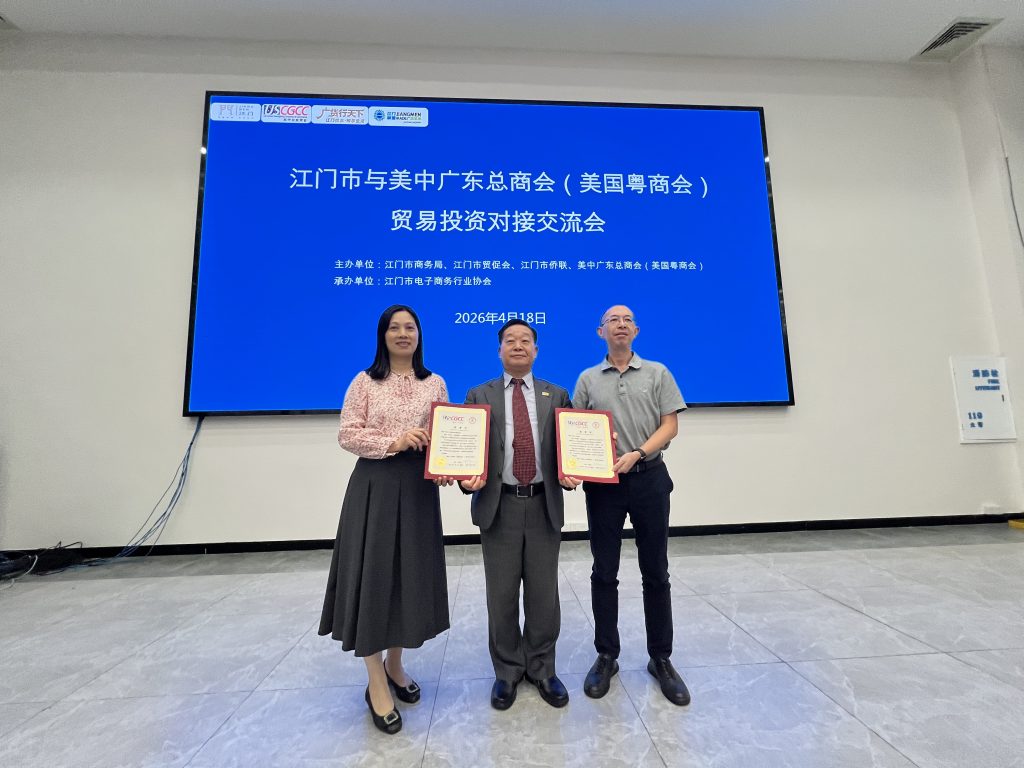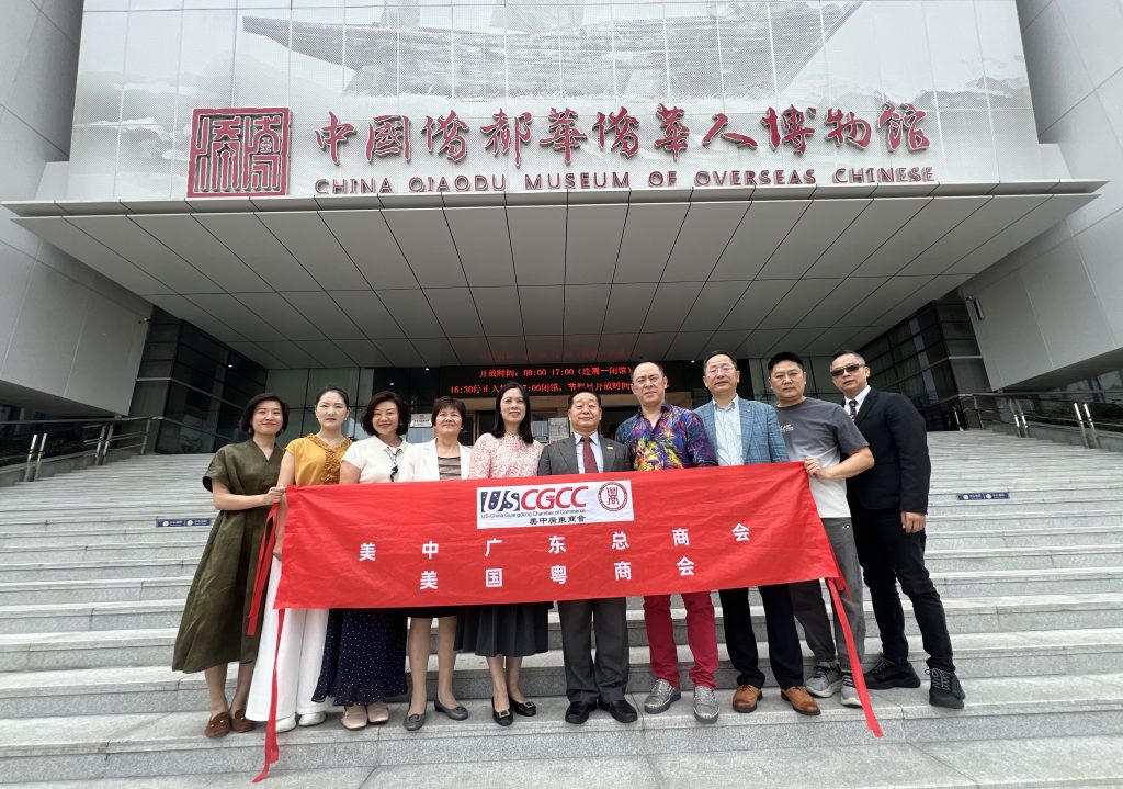 2026年4月18-19日 美中广东总商会(美国粤商会)广东考察代表团来到著名侨都江门市,受到江门市贸促会、国际商会、商务局和侨联的热烈欢迎。一到江门,领导们在江门五邑华侨华人博物馆等候迎接,代表团参观了博物馆,里面有江门华侨发展历史及修建美国太平洋铁路相关情况。同时了解了不少侨商在历史上的发展来之不易,激励了我们更要珍惜当今的宝贵机会为中美和家乡的发展作出更多的贡献。