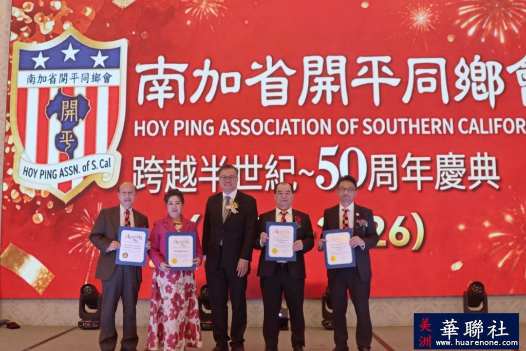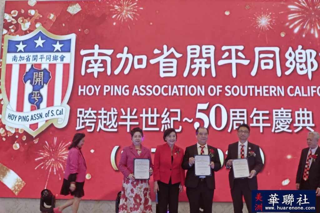 同日下午5時,慶典移師聖蓋博希爾頓酒店(San Gabriel Hilton)舉行。在晚宴開始前,大會迎來了多位主流政要親臨祝賀。美國聯邦國會議員趙美心博士(Dr. Judy Chu)及加州眾議員方樹強(Mike Fong)現場頒發表揚獎狀給南加州開平同鄉會主席羅淑珍、紐約開平同鄉會主席鄧學源、旅美開平同鄉總會主席司徒永峰以及西雅圖開平同鄉會主席等,肯定同鄉會對促進社區和諧與傳承中華文化的貢獻。此外,羅淑珍主席也代表同鄉會,正式向鄧學源與潘強淋頒發聘書,敦請兩位擔任名譽顧問,持續為會務發展提供寶貴指導。
