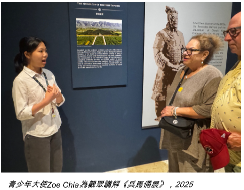 青少年大使Zoe Chia為觀眾講解《兵馬俑展》,2025項目創辦二十多年來,已培養超過200名學生,其中許多人進入知名大學深造,也有不少學生由此建立起對多元文化的長期興趣與熱愛。