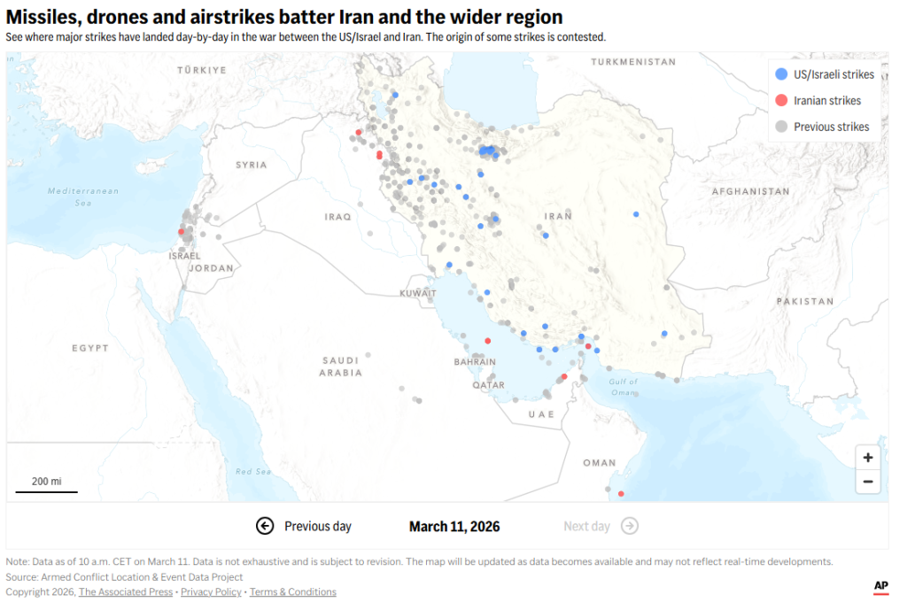 【美洲华联3月11日综合报道】据美联社报道,美国国防部长赫格塞斯周二上午表示,“今天将再次成为我们对伊朗境内目标进行最猛烈打击的一天。” 在同一场五角大楼新闻发布会上,美国参谋长联席会议主席表示,伊朗的导弹袭击已减少90%。